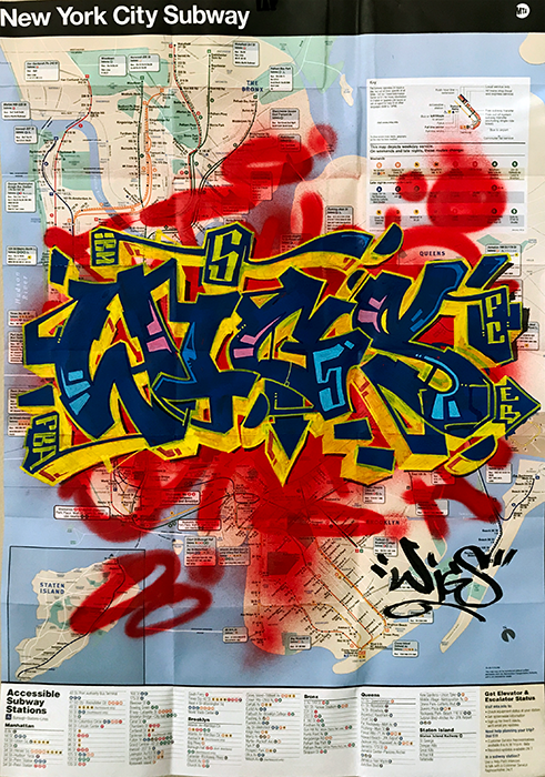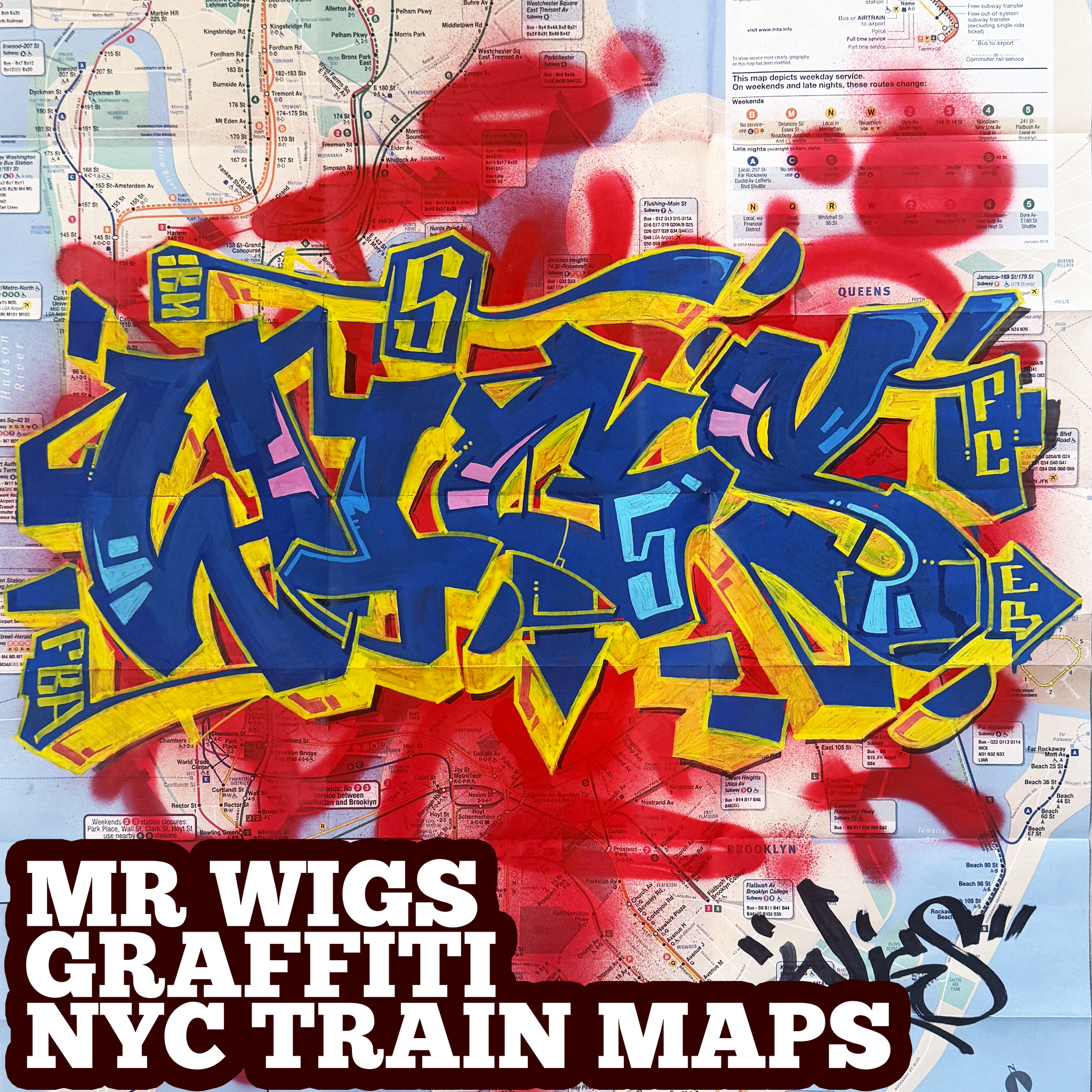 WIGS white Acrylics, and Spray Paint. 23/33 inch NYC Transit maps. (paper materiel) Classic New York Urban Art.